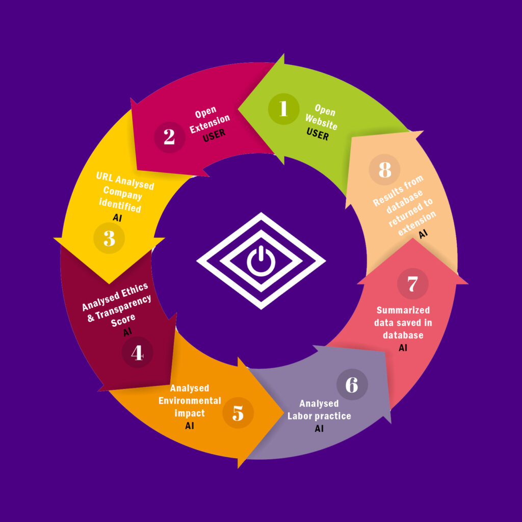 That’s when the idea hit me — an AI driven tool that helps anyone understand if the companies they buy from share their values. Not to make it overcomplicated, I decided that a browser (Chrome) extension could be the most user-friendly format, since analysis would be done without leaving the website you are already using, no need to copy the link and paste it into separate websites or apps.